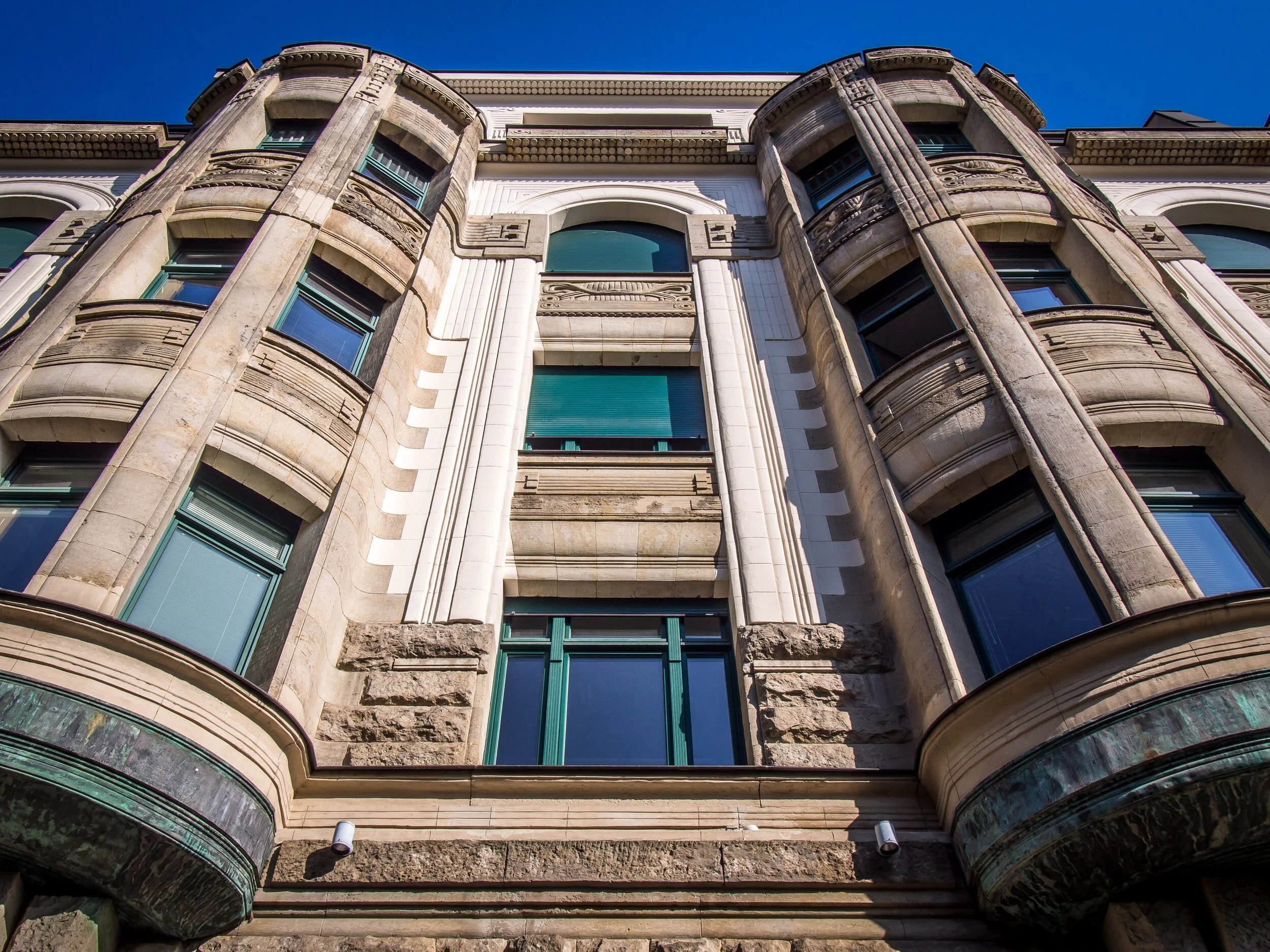 A corner window is a single unit comprised of two or more sashes that meet at a corner and span both sides of a building.
